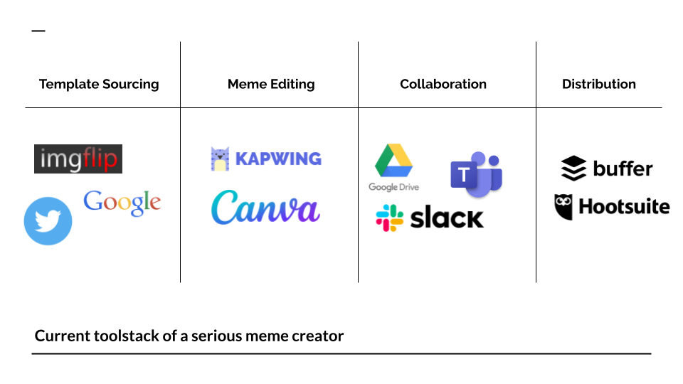 Meme creation today is a multi-step process and also a multi-tool process